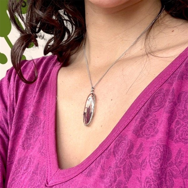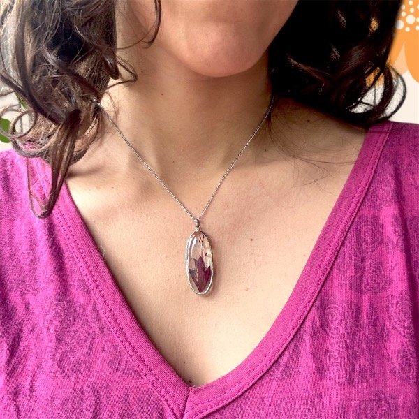 Este dije está elaborado con un pedacito de naturaleza seca, preservada y encapsulada en resina epoxi cristalina.