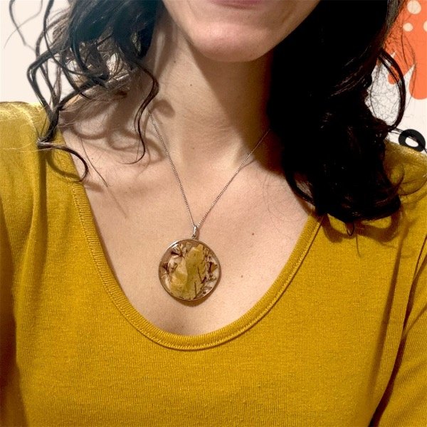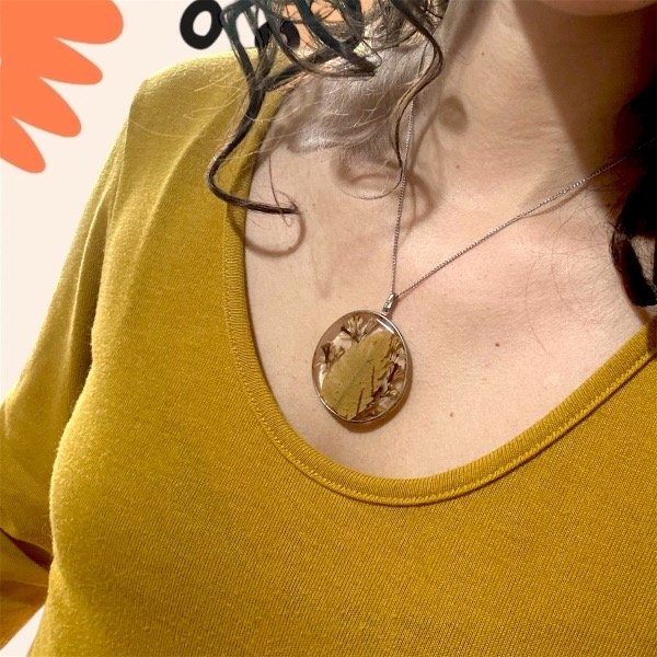 Este dije está elaborado con un pedacito de naturaleza seca, preservada y encapsulada en resina epoxi cristalina.