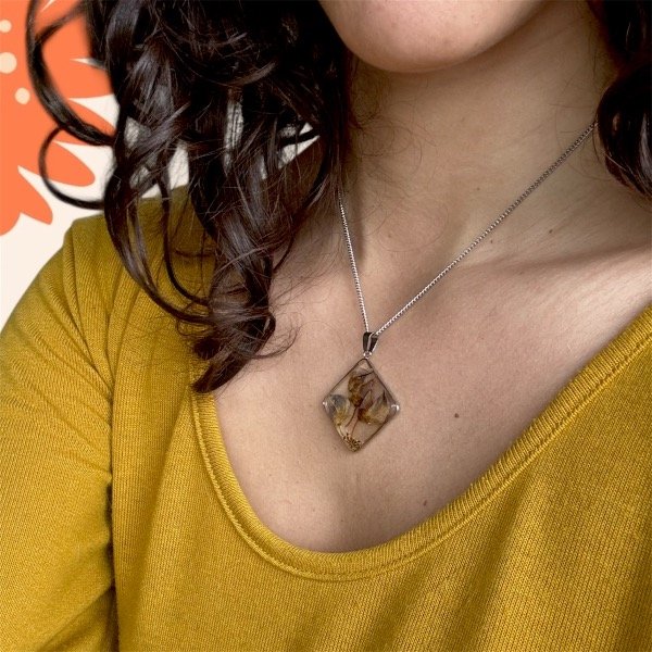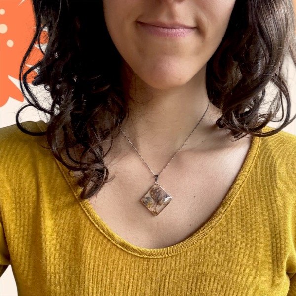 Este dije está elaborado con un pedacito de naturaleza seca, preservada y encapsulada en resina epoxi cristalina.