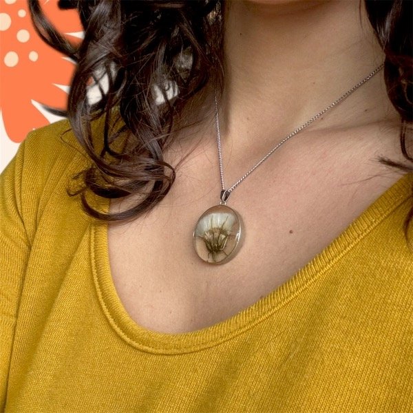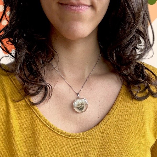 Este dije está elaborado con un pedacito de naturaleza seca, preservada y encapsulada en resina epoxi cristalina.