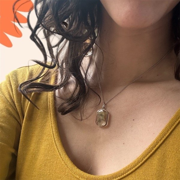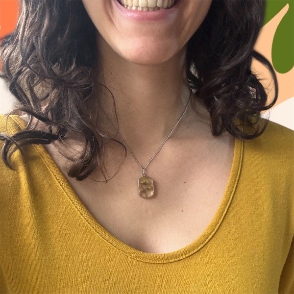 Este dije está elaborado con un pedacito de naturaleza seca, preservada y encapsulada en resina epoxi cristalina.