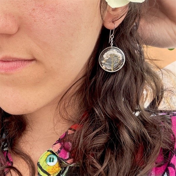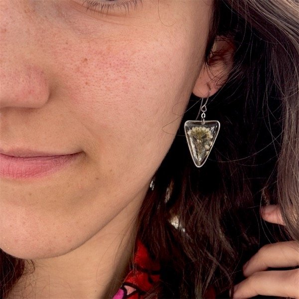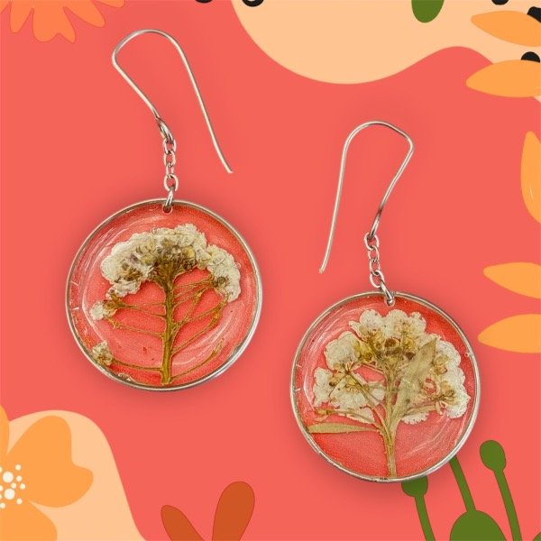 Par de aros con pasantes de acero inoxidable, con flores naturales encapsuladas en resina epoxi.