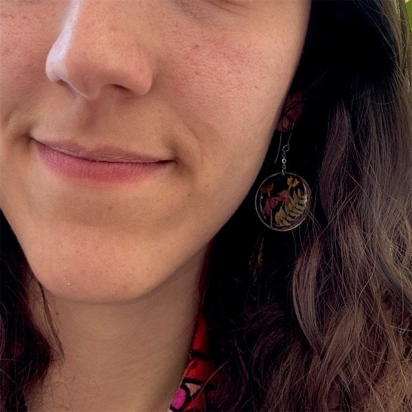 Par de aros con pasantes de acero inoxidable, con flores naturales encapsuladas en resina epoxi.