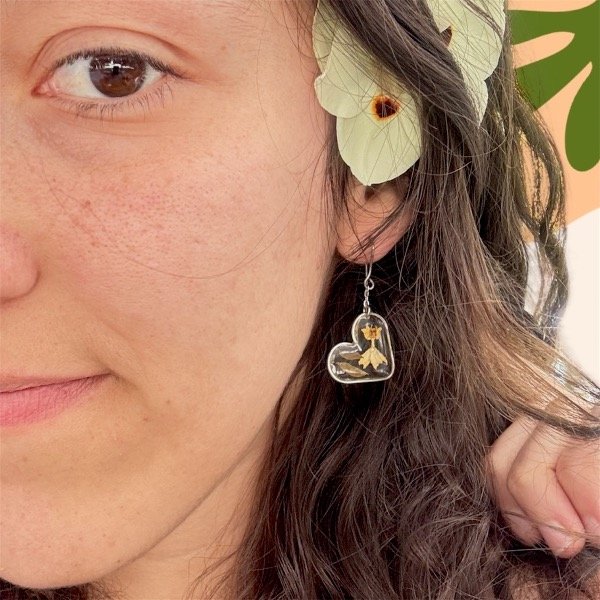 Par de aros con pasantes de acero inoxidable, con flores naturales encapsuladas en resina epoxi.