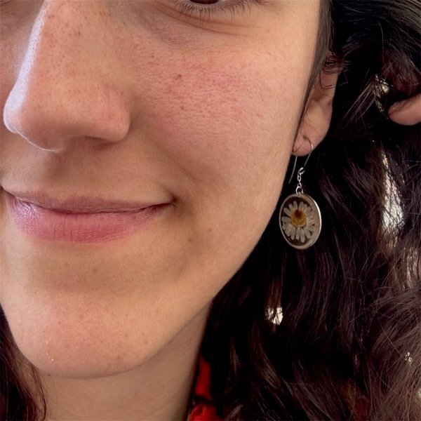 Par de aros con pasantes de acero inoxidable, con flores naturales encapsuladas en resina epoxi.