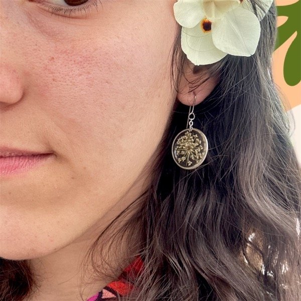 Par de aros con pasantes de acero inoxidable, con flores naturales encapsuladas en resina epoxi.
