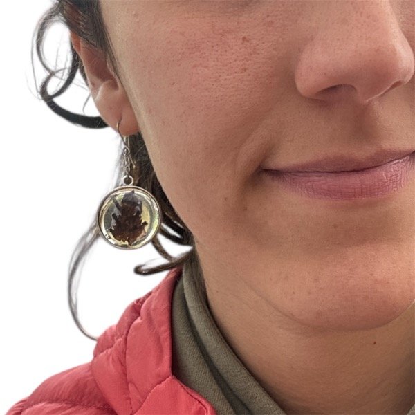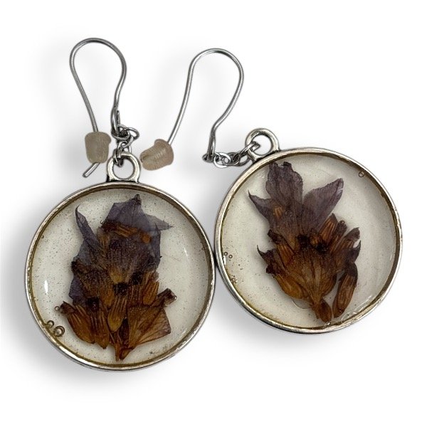 Par de aros con pasantes de acero inoxidable, con flores naturales encapsuladas en resina epoxi.