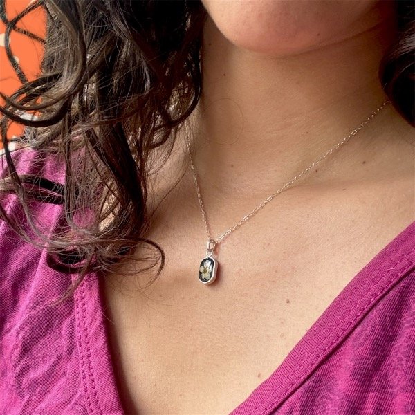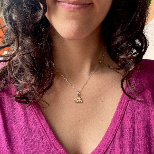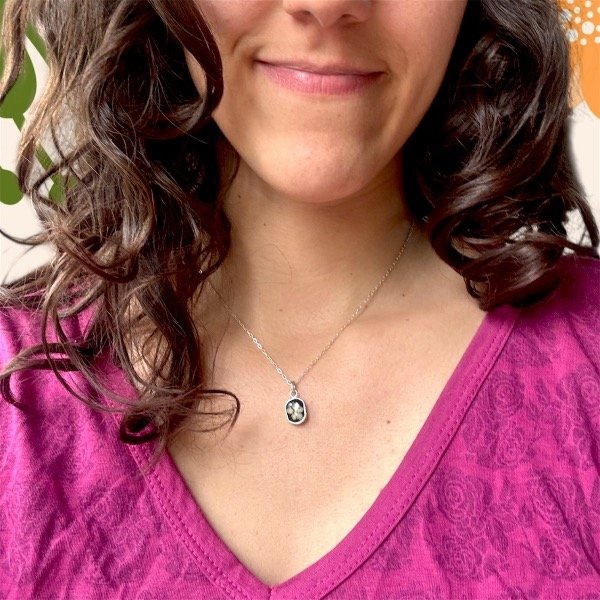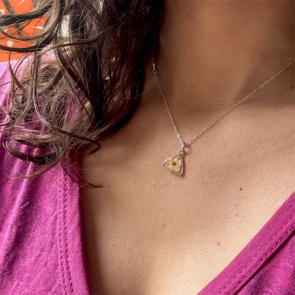 Este dije está elaborado con un pedacito de naturaleza seca, preservada y encapsulada en resina epoxi cristalina.