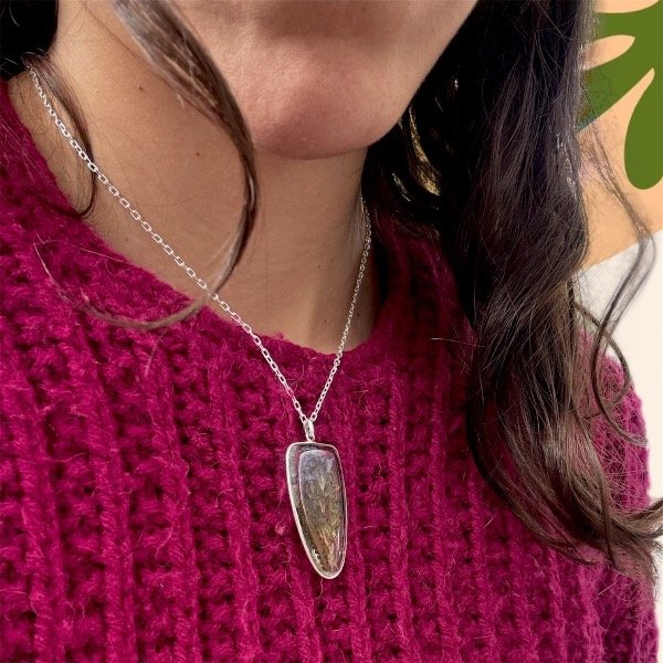 Este dije está elaborado con un pedacito de naturaleza seca, preservada y encapsulada en resina epoxi cristalina.