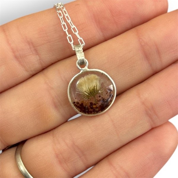 Este dije está elaborado con un pedacito de naturaleza seca, preservada y encapsulada en resina epoxi cristalina.